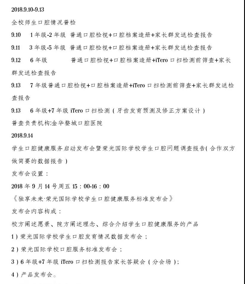 2、在学校设立定期牙医接诊制度,前期规划为1周2次的半天服务,初步定为:11:30-17:30,为学生提供基础治疗;