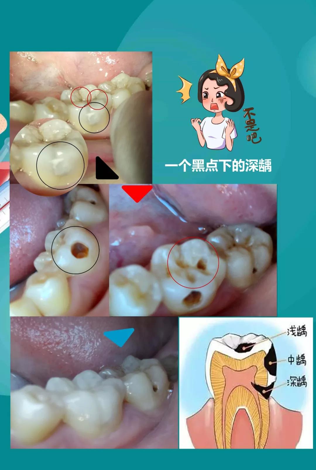 我们来看下以下案例:水女士发现自己后面的磨牙上面老是刷不干净,找牙医给她看了一下,发现已经严重蛀牙了,而且除了牙面上蛀牙之外颊侧的生长沟也发生了蛀牙。