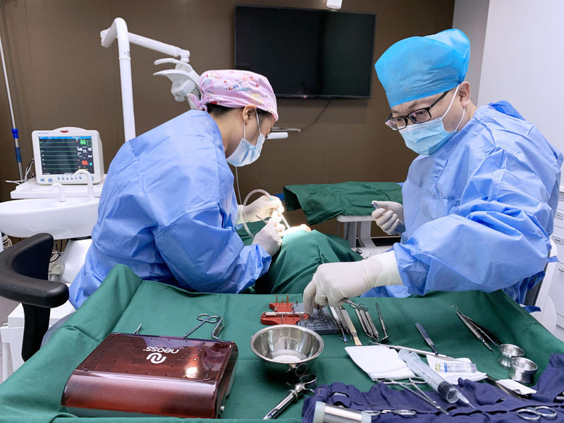 由于张先生下面半口牙暂时还能正常使用,曹副院长建议他只种上半口牙。他为张先生精心设计了种植方案,拔去6颗烂牙,通过“即刻负重”种植牙,为他植入4颗种植体,然后在上面架起一座“牙桥”,半口洁白整齐的牙齿就种好了。当天,张先生就啃起了苹果。