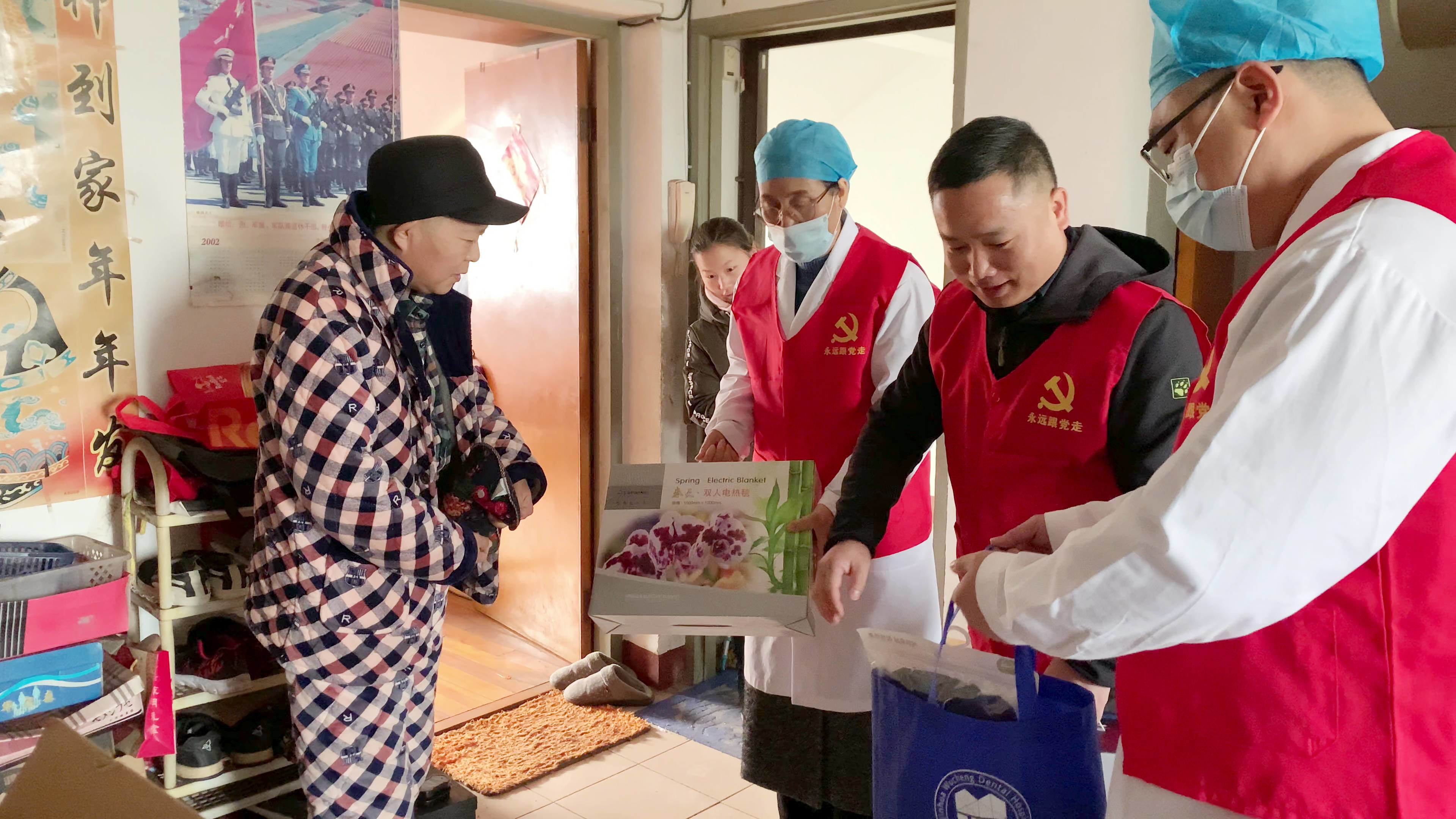 12月24日,婺城口腔医院医务工作人员和党员干部在东景社区开展“温暖传递人心”为主题的主题党日活动,为东景社区的老人徐根海送上牛奶、水果等慰问品,近日气温逐渐降低,还特地为他们置办电热毯等御寒物品。